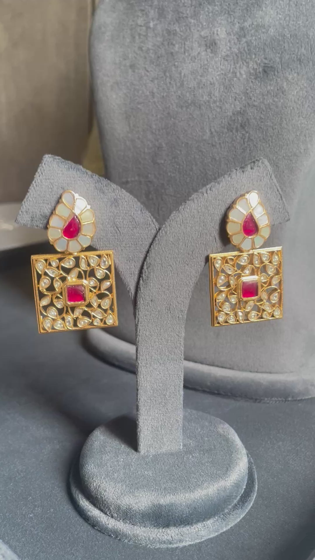 The Jharokha Filigree: The bold square drop is a masterpiece of gold filigree, featuring a delicate "jhaal" or lattice pattern that catches light from every angle.